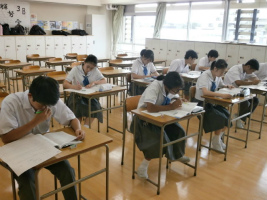 3年生対象の夏期講習全17日間が終了しました。午前、午後合わせて計4時間半を10名程度の少人数グループで学習します。グループによって進度は違いますが、各教科単元別に復習し、基礎を固めた上で入試問題演習に取り組んできました。課題は毎日3時間分。毎日の自主学習の積み重ねは、40日間で200時間を超える生徒も数多く見られます。講習の前後で顔つきも一層受験生らしく変わり、2学期に向けて実力と気持ちを高める講習となりました。