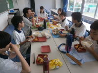 2年生の最大の行事である京都奈良学習が近づいてきました。クラスの枠を超えて編成した班で、自分たちの計画に沿って見学地をまわります。今日は班ごとに給食をとり、和やかな雰囲気で過ごしていました。当日を心待ちにする気持ちも伝わってきます。この行事を通して、お互いをより理解しあう学年になってほしいと思います。