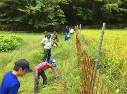 合宿2日目。メインは農業従事体験です。畑で育てられたズッキーニやパプリカ、ハーブ園のピーマンや万願寺の収穫と、畑周辺の雑草抜きを行いました。また別のグループの生徒は車で移動し、芦安の地域おこし協力隊の方にご指導いただきながら、田んぼや畑の草取りをしました。最後に、学園の象徴である「ムラサキ」の鉢植えを、玄関横の植え込みに植栽しました。それぞれが協調し、ひとつの作業を行うことで、大きな達成感を得られた日になりました。