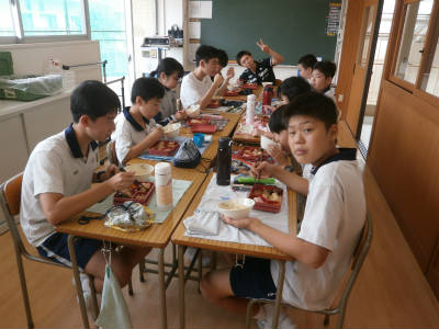 学年活動のひとつとして、各クラスから数名(2~6名)が他教室に行き、週に2回程度学年で給食を摂り親交を深めています。特に2学期は学校行事が続きスポーツ大会前は一層、互いに声を掛け合うことが多くなります。こうした機会から関わりを深め、スポーツ大会当日に向けて互いに志気を高めあっています。