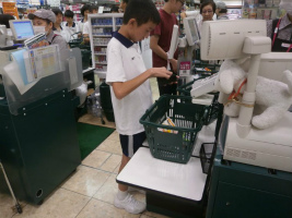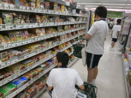 体験学習では、公共施設での見学や買い物を通じ公の場での行動の仕方を学んでます。今日は近隣のスーパーで買い物を行いました。案内掲示板を見ながら品物を捜したり、場所がわからないときは店員さんに聞いたりなど、昨年よりスムーズに買い物ができるようになったと思います。レジでの支払いをより敏速に行うために、お金の理解力を高めたり、レシートとおつりを受け取って落とさず財布にしまう練習は学校でもできるので数学の授業などで取り入れていくつもりです。