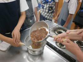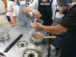 実習では、「調理」「木工」「被服」の分野にわかれ、指示理解力を高めたり作業スキルの向上を目指しています。今日は調理実習で、カツオを使っただしのとり方を学習しました。沸騰したお湯の火を1回止めてからカツオ節を入れます。3分ほど待ち、だし汁からカツオと取り除くために別のナベに移し変えるときはこぼさないよう声をかけました。だし汁だけで味見をし「うまみ」を実感してから、塩、しょうゆで味付けして美味しくいただきました。次回は、煮干のだしをとって美味しい味噌汁を作る予定です。