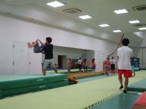 <器械体操>2グループに分かれ、ゆかとミニトランポリンを行いました。ゆかでは倒立などの基本運動の後、バク転や宙返りといったダイナミックな技に取り組み、ミニトランポリンでは着地止めの練習を中心に行いました。