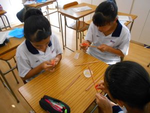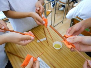 1年生の技術・家庭科では箸づくりを行っています。1学期に、木材を鋸やすりや紙やすりを用いて箸の形に整えました。今回は、箸に食用油を塗り込む作業を行いました。食用油を塗り込むことで、水に強く丈夫になり、さらに、赤身が増して美しい箸に仕上がります。また、各自、箸の形や長さ、模様にも工夫がされており、オリジナルの箸に仕上がっています。この箸は、以前に製作していた箸袋と共に来月行われる学園祭で展示する予定です。