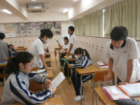 2年生の英語の授業では、教科書の文章を学習したあと、セクションごとに”Speaking test”を行っています。英文と日本語訳の書かれたワークシートを使い、ペアでお互いにテストします。一人が言う日本語を聞き、もう一人はその日本語を英語で言います。Speaking testに至るまでには、英文を様々なバリエーションで繰り返し音読しています。今日もほとんどの生徒がテストをクリアしました。今後も声に出すことを大切にして、英語を学んでほしいと思います。