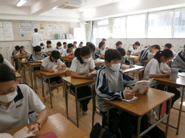 8時20分のチャイムが鳴ると「朝の読書」。図書活動委員会の生徒が中心になって声がけし、態勢を整えて読み始めます。10分という短い時間ですが、集中して本を読むことでその後の活動にスムーズに入ることができています。CDE組の生徒もお気に入りの本をクラスの本棚から取り出し、静かなひと時を過ごしていました。