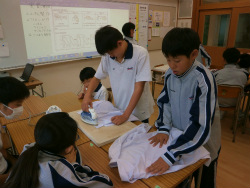 2学期の実習では、布巾の製作を行っています。今回は、それぞれ刺繍を終えて完成させた布巾のアイロンがけを行いました。自信のある生徒で、布巾よりも一回りサイズの大きいバンダナや、エプロンなどのアイロンがけにもチャレンジしました。準備から片付けも含めて、自主的に作業を進める姿が見られました。