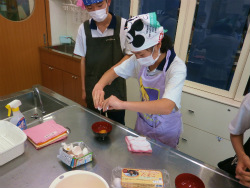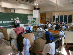 今回は、1年生にとって初めての調理実習。実習前の身支度を整え、使用道具の準備や片付けはグループごと手分けして行っていきます。今回は、調理の基本スキルである「たまご割り」にチャレンジ!テーブル拭きや手洗いなどの衛生面にも配慮しながら行いました。こういった調理の基本となる技術を習得することを目標に、経験を積んでいきます。