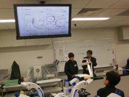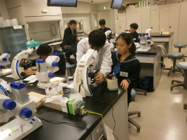 東中サイエンスラボとして法政大学の生命科学部実験室にて希望者を対象に「植物の病原菌 研究教室」を開催しました。一昨年から続き4回目になります。大学での観察会ということもあり生徒たちも期待を膨らませて臨みました。まず、担当の先生から植物の病原菌研究が食糧問題にどのように寄与しているかというお話があり、施設内を見学させていただきました。その後実験室に戻り、「クヌギのうどんこ病」と「はまなすのさび病」の観察をしました。各自がプレパラートをつくり、双眼生物顕微鏡で見ながらスケッチも行っています。さらに今回は『電子顕微鏡』でも観察ができ、未知なるさらに微小な菌を目の当たりにすることができ、生徒たちも感動していました。最後に班の代表生徒が、どんなことがわかったか観察記録をもとにプレゼンテーションを行いましたが、担当の先生からよりわかり易い記録方法のアドバイスもあり大変よい学習機会になりました。