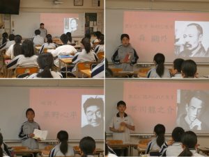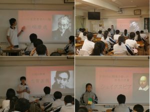 本校の国語の授業では、1、2年次の2学期に文学者レポートを作成しています。2年生は、各自が調べたいと思った文学者一人について調べ学習を行い、完成したレポートは学園祭で展示しました。それをもとに先週から、①略歴・文学を志した理由、②文学の特徴・テーマ、③お勧めの一冊と一行、④エピソード、⑤考察「文学の意義」、という流れで一人3分程度のプレゼンテーションを行っています。HR等でスピーチやプレゼンを数多く行ってきましたので、生徒たちも手慣れた様子で発表を行っていました。この学習を通して、文学者の生き様や文学の奥深さへの理解を深めて欲しいと思います。