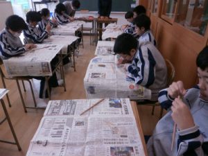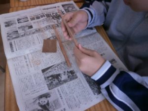 調理・被服・木工などに取り組む「実習」というカリキュラムがあり、実生活に必要な技術を高めています。今回は木工で紙やすりを使って箸作りを進めました。木材をやすりで削る作業で丸みができるように均等に削り、全体の太さを整えていきます。自分が使う箸になることを楽しみにそれぞれが真剣に作業に取り組んでいました。