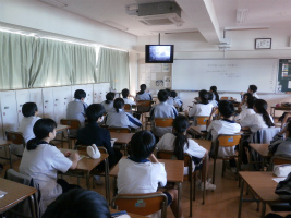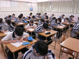 本校独自の教科である『生命科』は、「自分の存在の重さを知り、他の人の重さを感じることができる」という理想の生徒像を目標に実施されています。本日の生命科では、将来観のひとつとして働く意義について映像を通して考えていきました。「粉の出ないチョーク」や「ガラスに書けるチョーク」などのヒット商品を送り出した企業。従業員の70%が知的障がいを持つこの会社では、ほとんどの人が仕事にやりがいを持ち、働く喜びを感じています。何にやりがいや喜びを感じているのか。働くことによって得られる幸せについて考えを深めました。