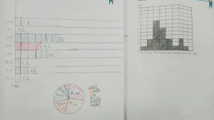 この単元に入って最初の授業では、いくつかのグループに分かれて様々なデータを集めて表やグラフにまとめるといった作業を行いました(写真はグラフの一例です)。他のグループの題材やグラフを見ることで、資料の特徴にも気づくことができました。