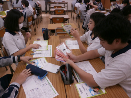 本校独自の教科である『生命科』は、「自分の存在の重さを知り、他の人の重さを感じることができる」という理想の生徒像を目標に、実施されています。将来観について学ぶ今回は「生活設計・マネープランゲーム」について説明を行いました。これは全国銀行協会が中高生向けに作っているもので、近い未来の生活をシミュレートし、消費や貯蓄など家計の管理に関わる基本的な事項について実感を持って理解することができるものです。年収や非消費支出、年代ごとの支出をマネープランシートとカード(収入や基本生活支出、イベントの費用が決まります)を用いて、基本的なお金の流れを計算し、貯蓄額を計算してみました。カードを引き人生の選択をしていくことで、計画性が必要なことも体感できたようです。