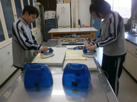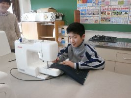 実習では、「調理」「木工」「被服」の分野があり、指示理解力を高めたり作業スキルの向上を目指しています。今日は、被服実習で巾着袋の製作です。図案の刺繍の仕上げを行い、終わった生徒からアイロンをかけてミシンで袋状になるよう縫っていきました。ミシンの作業は慣れていないせいか糸のセッティング等は先生の助言を受けながら行いましたが、縫う際は縫い目が曲がらないよう集中し自分で進めることができていました。袋の上部に糸を通して完成になります。