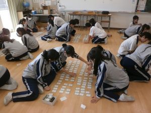 2学年国語科では、1年間かけて百人一首をひと通り学習してきましたが、今週の授業2回を使って実際にかるた取りを行いました。昨日は4人グループでの「ちらし」、本日は2対2の「源平合戦」です。皆楽しみながら真剣に勝負を臨み、札を取るスピードも大分速くなりました。「ちはやふる」という漫画や映画等で人気となった百人一首ですが、古典や和歌に親しむ良い学習機会です。今後も機会があればかるた取りを行い、慣れ親しんでいって欲しいと思います。