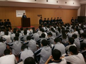 英語スピーチコンテストが校内にて行われ、予選を勝ち抜いた20名が本選に出場しました。1年生は”My favorite”、2年生は”My treasure”、3年生は”My opinion” のテーマで発表します。審査のポイントは内容、英語力、表現力を含めた「伝える力」です。英語の流暢さはもちろん、聴衆に訴える工夫がそれぞれに見られ、とてもハイレベルなスピーチとなりました。今年度取り組んできた英語学習の集大成となり、発表を聞いた生徒たちも多くの刺激を受けたようです。