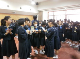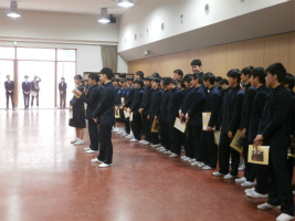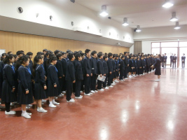 修了式の後、友愛会主催の送別会が行われました。はじめに3年生のこれまでの活動の様子がスライド写真として大画面に映され、皆で懐かしそうに過去の姿を振り返りました。3年前の入学式の写真が映ると1・2年生からは「かわいい」の声。照れくさそうにする3年生もいました。その後、在校生から3年生に思い思いの言葉を綴った寄せ書きのカードが渡され、歌の交歓が行われました。気持ちが高まり、在校生にも3年生にも涙ぐむ生徒がおり、互いの別れを惜しんでいたようです。最後に在校生がつくった花道を在校生が通り、送別会が終了しました。短い時間でしたが、先輩と後輩の心の通った会となりました。1・2年生は3年生の大きさを改めて知り、「次は自分たちが学校を担っていく」という思いで、3年生を見送ることができました。