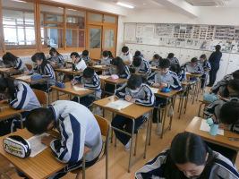本校独自の教科である『生命科』は、「自分の存在の重さを知り、他の人の重さを感じることができる」という理想の生徒像を目標に、実施されています。3年生の1学期の生命科単元は「平和」。「過去の事実を知る」をテーマに、1回目は特攻隊を題材にしたビデオを視聴しました。特攻隊員の遺書や生き残った方の証言を聞くことで、戦争とは、平和とは、命とは何かを2回にわたって考えていきます。