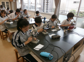 1年生理科では、双眼実体顕微鏡に続き、顕微鏡の使い方について確認を行っています。一人一台ずつあるので、個人で練習を行った後、自信のある生徒から実技テストを受けるという方法をとりました。合格した生徒には検定合格証を発行し、これからの授業で顕微鏡を活用していきます。
