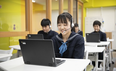 授業はオールイングリッシュで行うこともあり、言語習得の基本である4技能を効果的に学んでいます。例えば1つの単元において文法学習のあと、スラッシュリーディング、シャドーリーディング、スピードリーディングといった徹底した Reading を行います。さらに Speaking、Writing と進む過程で生きた英語を身につけていきます。また、常勤のALT(外国語指導助手)が日常の英会話環境をサポートし、Listening と Speaking をはじめとした4技能を向上させています。さらに週1時間の英会話の授業はコンピュータを通じ、外国人講師とオンラインで行います。マンツーマンで行うため、発音や文法の細かい部分まで指導やフィードバックがあり、より自然な英語を身につけることができます。
