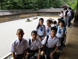 私たち2班は、マイケル先生と一緒に龍安寺へ行きました。石庭には大小あわせて14個の石がおいてあり、大迫力でした。しかし、本当は15個の石があるそうです。私にはすべてを見つけることはできなかったけれど、もし機会があったら、すべての石を見つけたいです。実行委員 K.M
