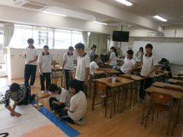 私たち3Aは学園祭に向け、模擬店看板制作、のぼり制作、装飾制作の3つのチームに分かれて作業を行っています。中学校生活最後の学園祭を盛り上げるため、どのチームも自分たちの仕事に責任を持って取り組んでいるところが私たち3Aの持ち味です。こんな私たちの姿を見に、ぜひ学園祭にいらしてください!! (K&K)