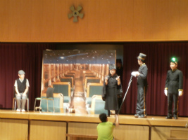 2CDEは『銀河鉄道の夜』です。気弱な少年ジョバンニが、友人カムパネルラと銀河鉄道で宇宙を旅します。そこで出会う様々な人々は、実はすでにこの世を去っていて、星になっていくために銀河鉄道に乗っていたのです。そんな人々から生きる意味、幸せの意味をジョバンニは学んでいきます。そして、最後にはカムパネルラとの別れが…。2年生が堂々と演じます。待っていました。