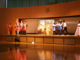 3CDEは『三銃士』です。王国が舞台。厚い友情で結ばれたダルタニアンと三銃士が王座を狙うリシュリューに立ち向かう姿を、生き生きと描いたアレクサンドル・デュマの傑作です。「一人はみんなのために、みんなは一人のために」をテーマに、3年生全員が心を一つに一生懸命演じます。