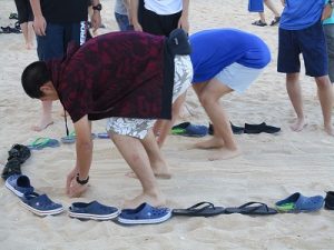浜に皆で出てサンダルなどを利用して「〇〇・・」(内緒です)の文字を作りました。皆で写真を撮ったのですが、やっぱりすごい作品だと思いました。今日の活動ではカヤックを行ったのですが、とても難しかったです。友達とたくさん交流ができたのでとても楽しい日になりました。また、どこかに行ったときに海辺散策を個人でも楽しんでみようと思います。