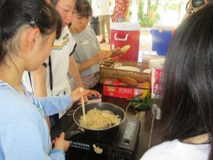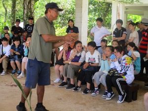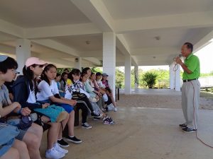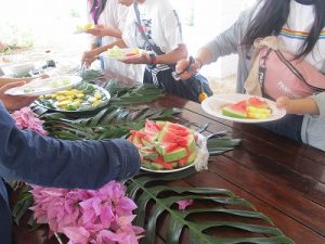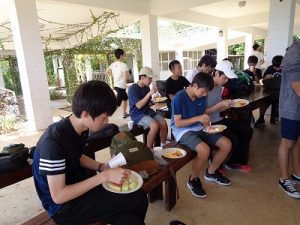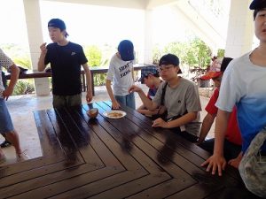今日は、朝からハマモトフルーツワールドに向かいました。到着して代表の濱本さんが出迎えてくれ、濱本さんのお話から始まりました。そこで育てられた代表的なフルーツをいただいたり、トラムコースで園内見学をしたり、ココナッツ体験教室では、いろいろな話も聞きました。今日は、グアムならではのフルーツを堪能し、東京では体験できないような自然の中での活動ができ、忘れられない思い出となりました。