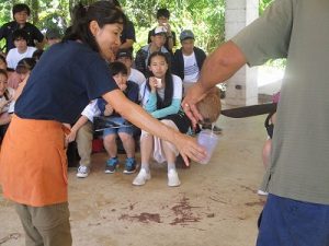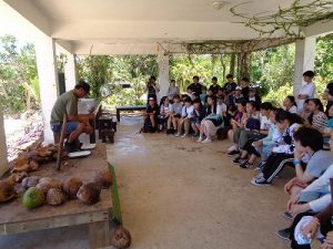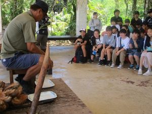 園内でスイカやメロン、パイナップルやココナッツを食べました。ココナッツ体験教室では、ココナッツを割ったり、実を削るところとココナッツミルクを取り出すところも見ることができました。