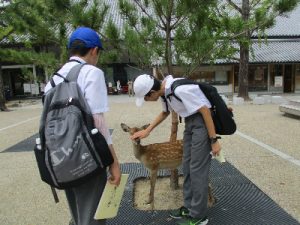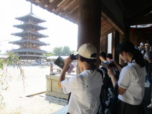 京都奈良学習で最初に訪れる見学場所は法隆寺です。法隆寺は世界最古の木造建築であり、金堂や五重塔、そして国宝や文化財がありました。私自身も初めての訪問で、特に玉虫厨子の巨大さに驚きました。また私たちは金堂で、おなじみのアルカイックスマイル(釈迦三尊像)、ほかにもエンタシスの柱など、今まで事前学習で学んだことを自分たちの目にやきつけることができ、良い学習になりました。 実行委員 K.T