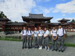 1班です。私たちは、平等院鳳凰堂と伏見稲荷大社へ行きました。平等院鳳凰堂は阿弥陀如来を観想するために作られ、落ち着いた雰囲気を感じました。伏見稲荷大社では、千本鳥居が印象的でした。わたしたちはそこで外国人観光客の方に、何をしに日本を訪れたのかなどのインタビューをしました。