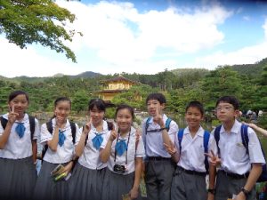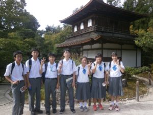 私たち3班は、金閣寺に行きました。金閣寺は三層になっていて、一層目は寝殿造り、二層目は書院造り、三層目は禅宗様式です。金閣の屋根の上には金箔をはった鳳凰が飾られています。この鳳凰とは、いろいろな生き物が合体した体なのだということです。