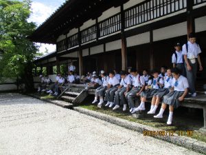 2日目はクラスのみんなで金閣寺に行きました。金閣寺は「鹿苑寺」ともいいます。足利義満が作り、1994年に世界遺産に登録されました。金に輝いていて、とても美しかったです。金閣寺境内にある「夕佳亭」と「不動堂」も見ました。