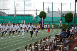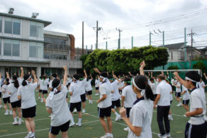 こんにちは。PR委員会です。今日は、スポーツ大会を目前に控えた武蔵野東中学校の様子を紹介します。スポーツ大会の本番が明後日に迫り、ラストスパートを頑張ろうとしている姿が見られます。先週、中距離走・ハンドボール・50m走の予選が行われ、決勝に出場する人が決まりました。また、昼休みにはチームごとの応援、縄跳び推進プロジェクトの練習が進められています。勝ちたいという気持ちから、縄跳びを持ち帰って家で練習に励む人や、朝の時間を使って練習する人もいます。私もCDE組のペアの友達と日々練習に励んでいます。私のチームでは、確実に跳べるように縄跳びの練習や他のチームに負けないくらいの声の大きさになるよう掛け声の練習などを積極的に行っています。今週の火曜日には、スポーツ大会の予行練習が行われました。雰囲気を感じ、より緊張感が高まったと思います。予行練習を踏まえ、反省点をチームリーダー中心に話し合ったので、当日活かすことができるようにしたいです。新型コロナウイルスの影響で、これまでとは異なる進め方になっているため、慣れないことも多いですが、いろいろな変更点に臨機応変に対応し、スポーツ大会の成功に向けて頑張りたいと思います。 ※画像はスポーツ大会予行の様子です。