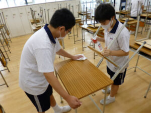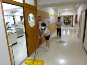 こんにちは、アクティベーション委員会です。私達アクティベーション委員会は学校を活性化するため、さまざまなことに取り組んでいます。その一つが他のクラスや学年と交流する「縦割り活動」の推進です。7月に入り、今年度の縦割り活動をスタートさせました。現在は週に一度、朝の清掃活動を縦割り班で行っています。最初は慣れない様子でしたが、班のメンバーとコミュケーションをとりながら、協力して清掃ができるようになってきました。来学期も学校生活の活性化のためにアイデアを出して活動していきます。(副委員長 3年T.M)