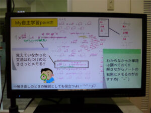 こんにちは!アクティベーション委員会副委員長です。 アクティベーション委員会の学習グループでは、全校生徒の学習面での活性化のために活動を行っています。 今回は自主学習ノートの工夫を3年の委員が教科ごとにスライドにまとめ、給食時に放映と解説をしました。スライドづくりでは、写真や図を使い伝わりやすいよう工夫しました。テスト前の放送だったので、参考になったのではないかと思います。