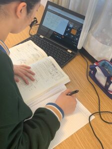 こんにちは!PR委員会です。 オンライン授業が順調に進んでいます! こちらがその時の様子です。(理科の授業です☆)オンライン授業では先生が生徒を指名しながら課題の答えを確認し、解説をしてくださいました。通学時間がない分、時間を効率的に使うことができました。休み時間に友達と会えず寂しいですが、オンラインで授業をするのもまた新鮮で楽しかったです! 午後はそれぞれの教科から与えられた課題を解いて、後日全部提出できるようがんばります! PR委員 K.S