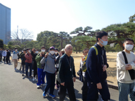 最初に行った皇居では、楠木正成像があり、とても勇ましそうに見えました。桜田門の櫓が工夫されていたのも印象に残りました。横浜ガイドウォークでは、日本最初の汽車が展示されていたことに驚きました。日本丸の大きさにも圧倒されました。ガイドさんが細かく丁寧に教えてくれたのが、よかったです。ディナークルーズは、コース料理がとても美味しくて、夜景も綺麗でした。明日の鎌倉もとても楽しみです。 3年C組 H.S