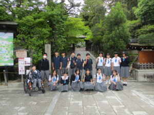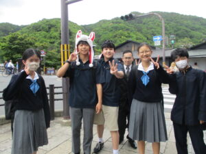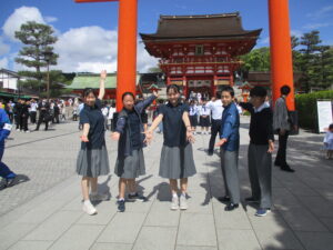私が一番印象に残ったのは、伏見稲荷大社でした。稲荷大社で有名な千本鳥居の中を通りました。時間の都合で最後までは登れず途中で引き返しました。私達が訪れた時ちょうど大きな鳥居の付け替えの工事などをしていました。一番驚いたのは、ほとんどの鳥居は木製で朱色に塗られている中、数個の鳥居だけが石製であったことです。更にその鳥居の建立を見たら大正と書かれていたことでした。(Fさん)