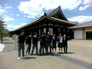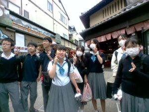 私達は京都奈良修学学習3日目で清水寺、三十三間堂、東寺、方広寺に行ってきました。ABクラスとCDEクラス一緒になって建物を見たりお土産を買ったりしていました。周りの人への配慮を忘れずに十分楽しむことができました。限られた時間の中でスムーズに団体行動をこなすしているところが3年生らしいと感じました。