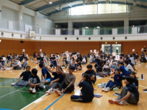 全学年の縦割り班による顔合わせレクリエーションを行いました。CDE組は山中湖へ合同合宿に行っているため、AB組の生徒のみで開催しました。アクティベーション委員会が主体となり企画した活動の1つ目は、メンバーの名前を覚えることを目的としたもので簡単なゲームです。自己紹介もかねて、お互いの名前を楽しく覚えることができました。2つ目は「趣味暗記ゲーム」それぞれの趣味や好きなことを知ることができました。最後にアクティベーション委員による、学校クイズです。先生方に関わるクイズが多く出題し、生徒だけでなく先生方も楽しんでいたと思います!今後はこの縦割り班で清掃活動などをやっていきます。