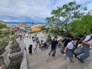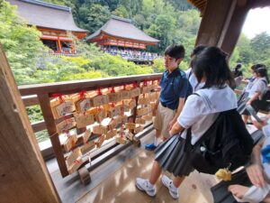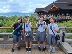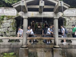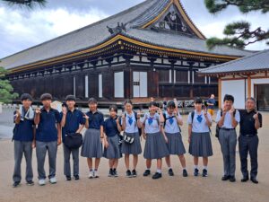 3日間お世話になった宿を後にし、清水寺へ出発しました。昨日とは異なるA~E組が混ざったグループで、おみやげなども買い楽しい時間となりました。AB組とCDE組が合同の合宿は2回目だったので、みんなで協力して活動することができました。清水の舞台で撮った写真は皆にとって大切な思い出です。次に訪れた三十三間堂では1001体の千手観音に囲まれて普段感じることのない雰囲気の中、京都最後の時間を楽しみました。(A組O.K./ M. W.)
