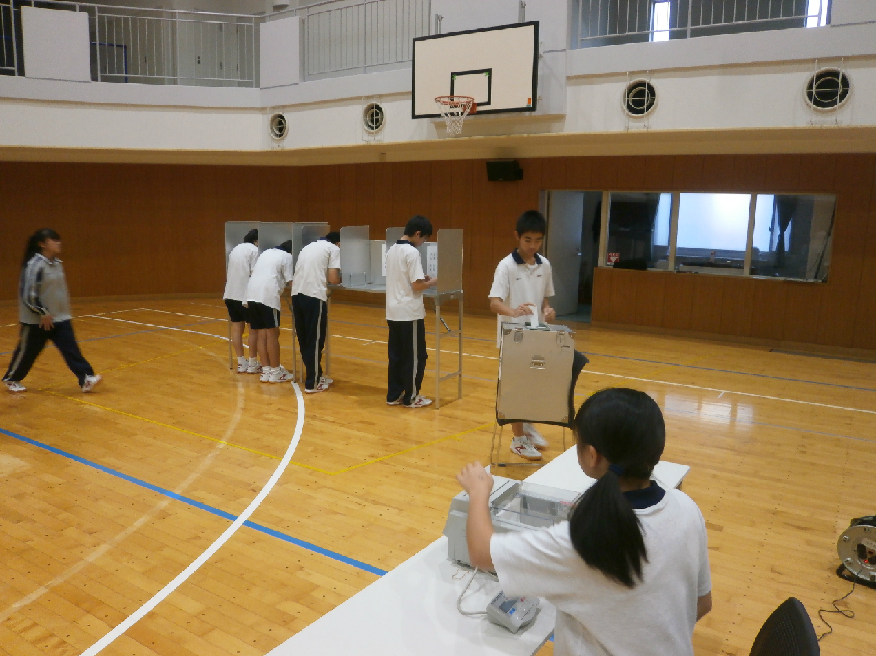 本日、10月26日。武蔵野東中学校では、新規友愛会役員を決める選挙を行いました。投票所では、市役所から衆議院議員選挙でも使われた本物の選挙用具を使い、厳正な雰囲気の中、選挙を行いました。私たち選挙管理委員会は、前日に行われた立会演説会や、立候補受けつけなど、多くのことに携わってきました。