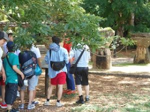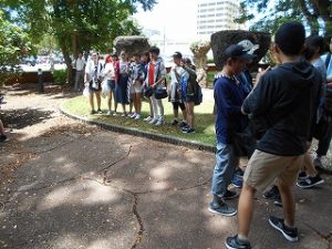 グアム2日目になりました。今日は島内観光しました。二か所目であるラッテストーン公園をめぐり、三つめの観光場所であるスペイン広場を訪れました。そこには、当時のスペインの総統が、チョコレートを渡した場所とされるチョコレートハウスや総統が使っていたとされる大広間などもありました。あくまでも当時の再現で作られたものですが、昔のグアムの情景などが目の前に自然とよみがえってくるような場所でした。見学の後、スペイン広場内で写真の撮影をしましたが、その時のみんなの笑顔から、ちょこっと歴史を体験した喜びのようなものが伝わってきました。